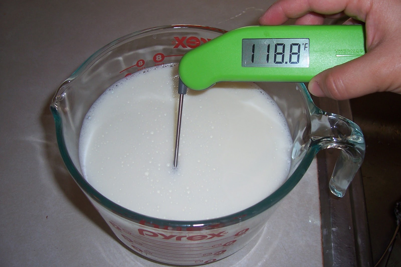 3. Meanwhile, I gently heated my milk in a large saucepan until it registered 185 F. This was definitely the most time-consuming part, requiring the most attention, especially as I started to get close to 180 F. I knew that you couldn't let it get much over 185 F or you could damage the milk. I stirred the milk occasionally, although again my sources were mixed as to whether this step was necessary.